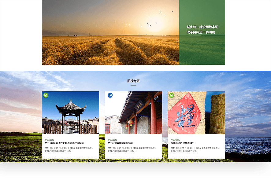 中储粮官网采用扁平化ICON的方式,集中展示储备管理、轮换购销、专项调控等多元业务,在保证用户便于阅读的基础上,通过创意、交互吸引用户关注。新闻聚合频道