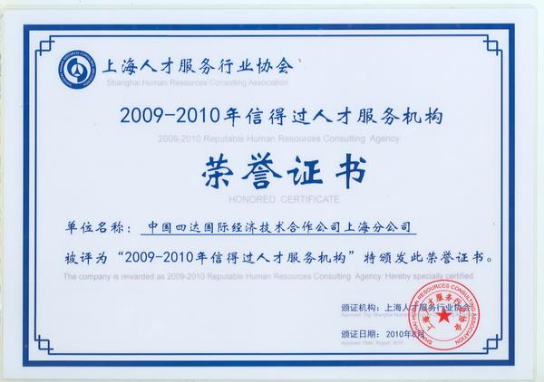 在中国四达ledong乐动(中国)体育官方网站全体员工的团结努力下,近日,在上海人才服务行业协会评选的“2009—2010年上海市信得过人才服务机构”活动中,我ledong乐动(中国)体育官方网站荣获了“信得过人才中介机构”的荣誉称号,至此,ledong乐动(中国)体育官方网站已连续八年获此殊荣。
