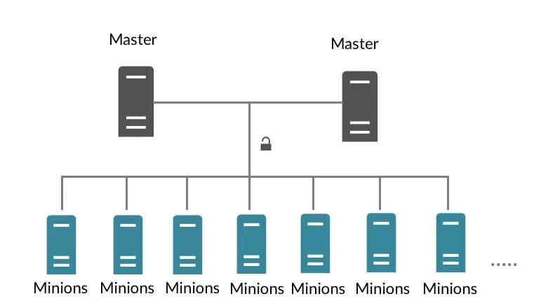 从部署结构上看,SaltStack的在部署上可以分为master和minion两个部分,其中master相当于统领所有机器的总管,而minion则是部署在被管理机器上面的agent进程,master通过网络将配置管理相关的操作下发到minion,由minion在对应机器的本地执行。典型的部署例子如下图所示: